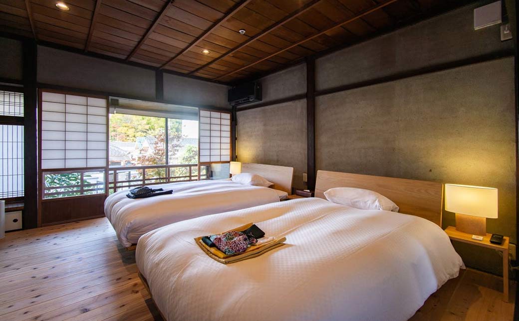 YOMENA:The YOMENA building is a fully private townhouse, formerly a merchant’s residence. The first floor features a dining area, a Japanese-style room, a cypress bathtub, and a terrace, while the second floor offers two bedrooms. Ideal for families or for couples seeking a luxurious